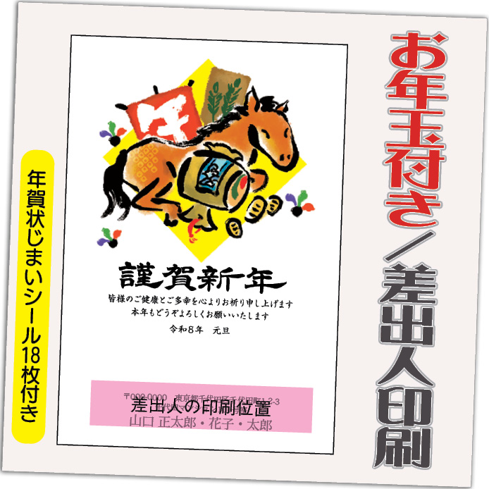 年賀状 年賀はがき 12枚 お年玉付き 年賀状じまいシール付 2026年 差出人印刷込み(デザイン:GE09) うま 馬 午年 かわいい イラスト 10枚+2枚