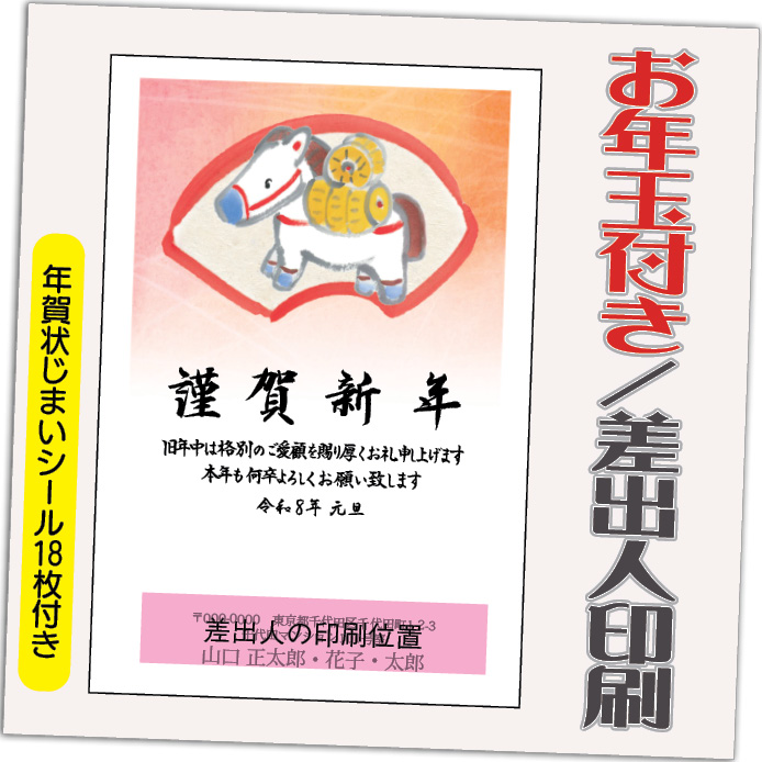 年賀状 年賀はがき 12枚 お年玉付き 年賀状じまいシール付 2026年 差出人印刷込み(デザイン:HA033) うま 馬 午年 かわいい イラスト 10枚+2枚