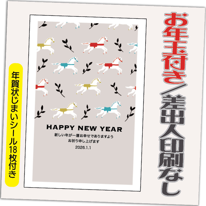 年賀状 年賀はがき 12枚 お年玉付き 年賀状じまいシール付 2026年 差出人なし(デザイン:HA074) うま 馬 午年 かわいい イラスト 10枚+2枚