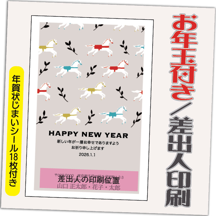 年賀状 年賀はがき 12枚 お年玉付き 年賀状じまいシール付 2026年 差出人印刷込み(デザイン:HA074) うま 馬 午年 かわいい イラスト 10枚+2枚