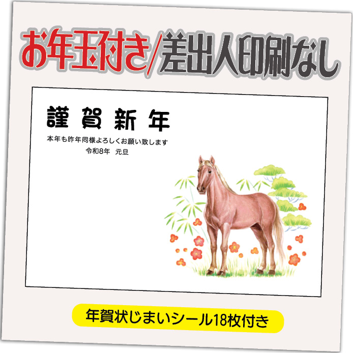 年賀状 年賀はがき 12枚 お年玉付き 年賀状じまいシール付 2026年 差出人なし(デザイン:HA162) うま 馬 午年 かわいい イラスト 10枚+2枚