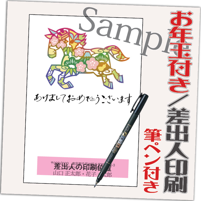 年賀状 年賀はがき 12枚 お年玉付き 年賀状じまいシール付 筆ペン付き 2026年 差出人印刷込み(デザイン:B0197) うま 馬 午年 かわいい イラスト 10枚+2枚