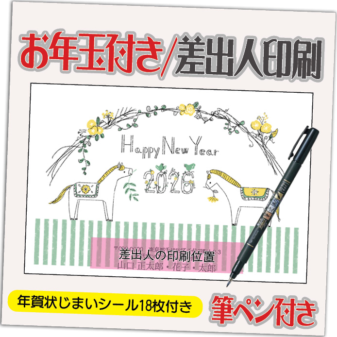 年賀状 年賀はがき 12枚 お年玉付き 年賀状じまいシール付 筆ペン付き 2026年 差出人印刷込み(デザイン:B0317) うま 馬 午年 かわいい イラスト 10枚+2枚
