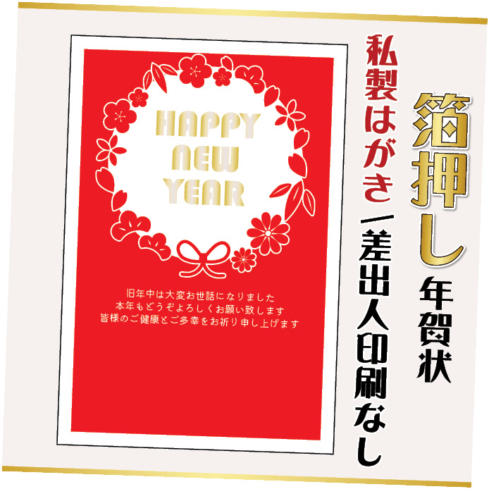 挨拶文の印刷があるので相手先さまの住所をプリンターで印刷したり、書いたりするだけで、手早くすぐに投函できる箔押し年賀状です。