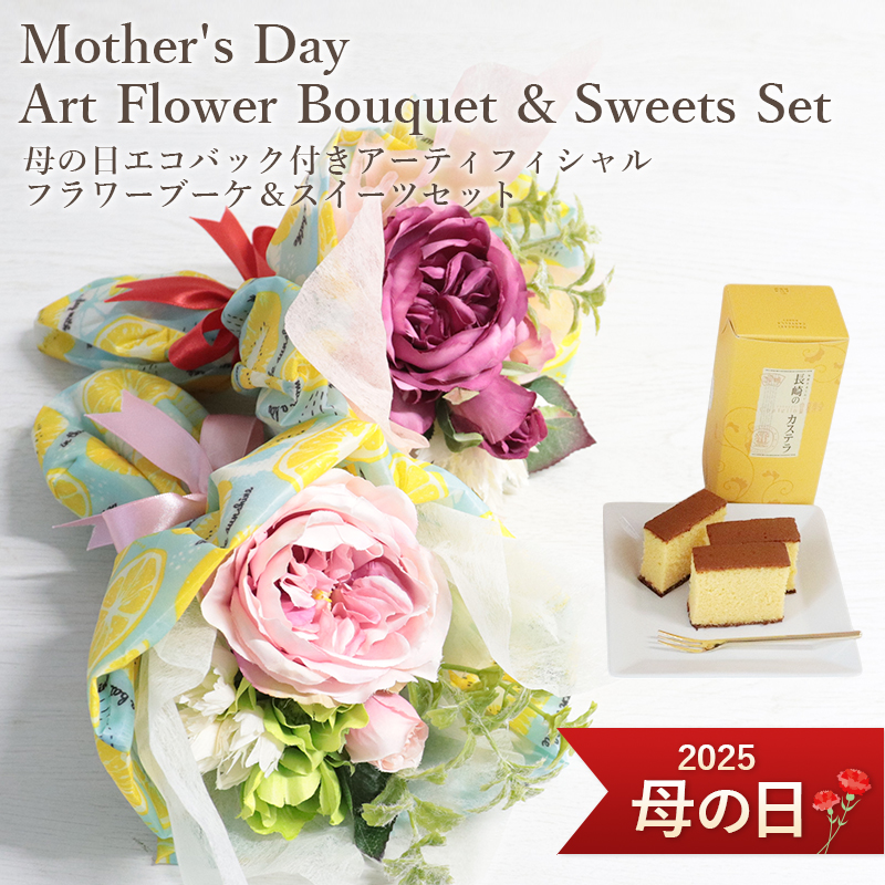 フラアート花門の母の日エコバッグラッピング付きフラワーローズブーケ(アートフラワー)とカステラのセット