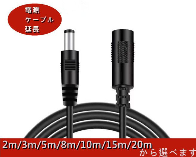 電源延長ケーブル 2m/3m/5m/8m/10m/15m/20m 防犯カメラ専用 防犯カメラ、LEDライトなどの電源延長用 電源延長コード 黒