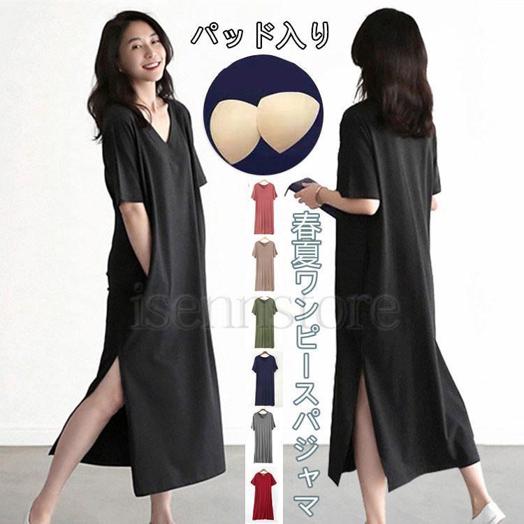 【特価】パジャマ ワンピース Vネック 半袖 ルームウェア レディース 夏 ロングワンピース モダール パッド付き スリット ネグリジェパジャマ 寝巻き