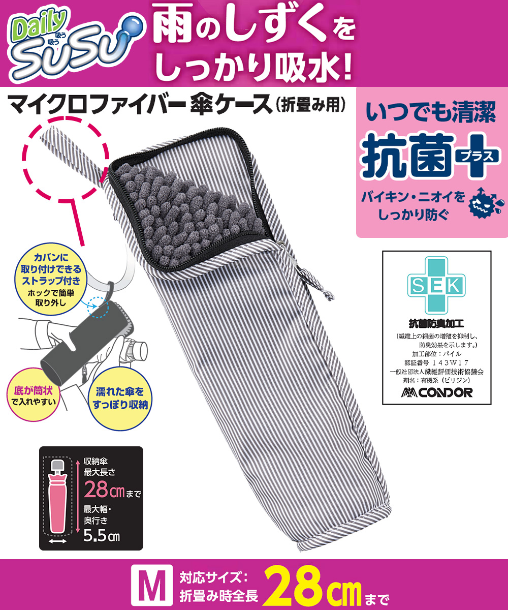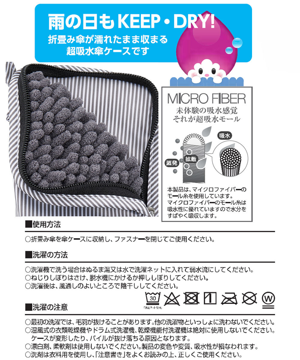 雨のしずくをしっかり吸水。折りたたみ傘が濡れたまま収まる超吸水傘ケース。