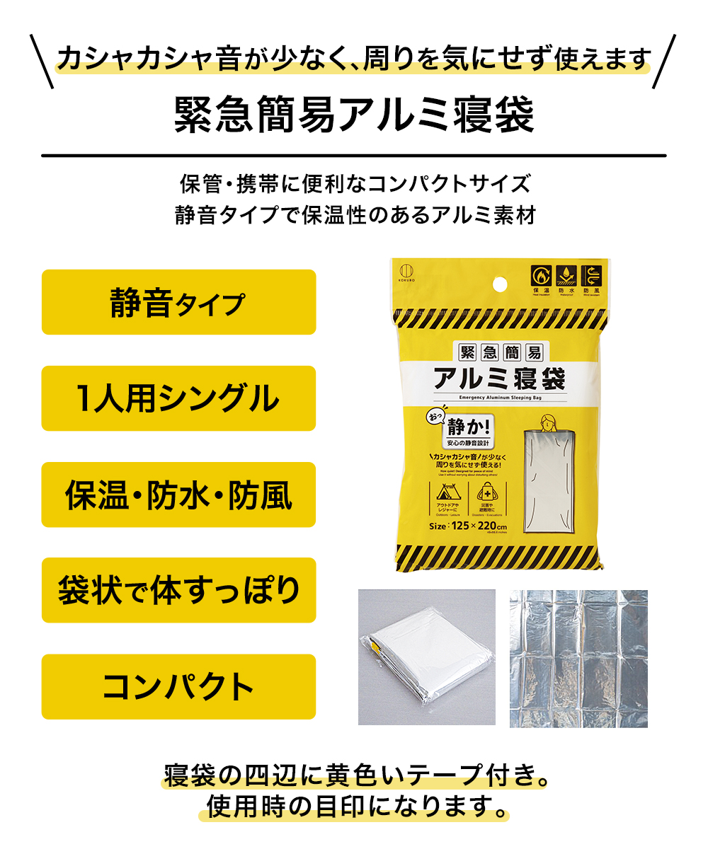 ◎アルミニウム・低密度ポリエチレン製の緊急簡易寝袋。静音タイプ。