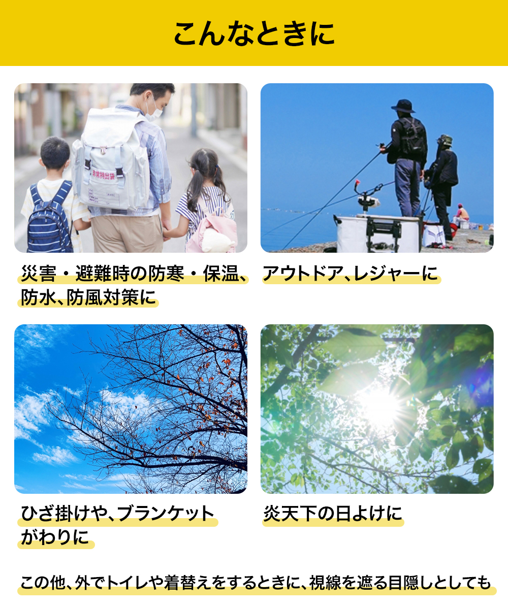 ◎緊急避難時や、アウトドアでの防寒・保温、防水、防風対策に。