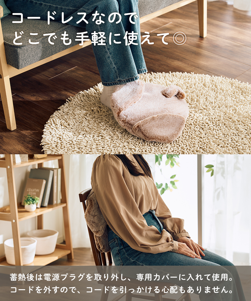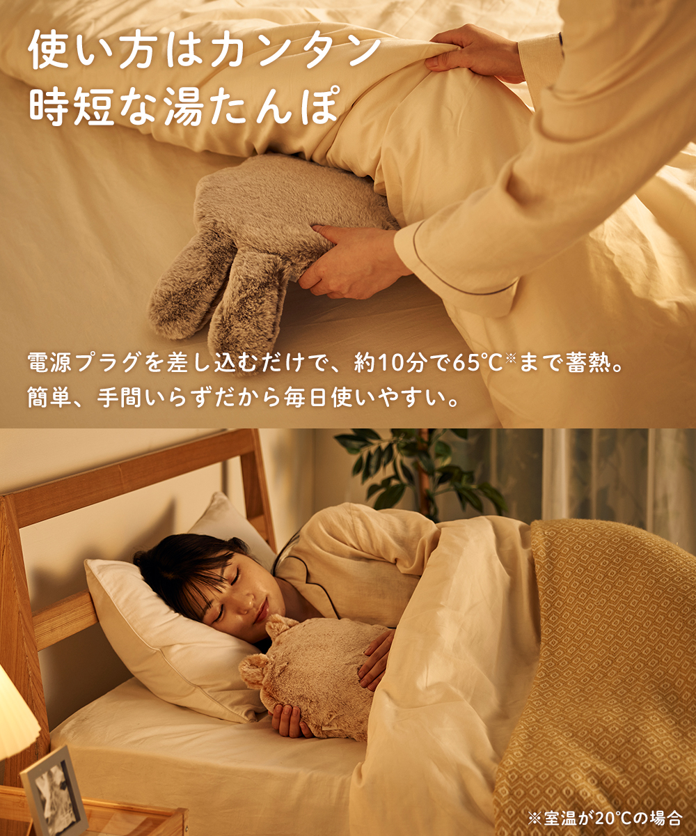 電気で本体内部の水をあたためて熱をためるため、面倒なお湯の交換が不要。約10分の蓄熱で最長約8時間あたたかさが持続するので、就寝時には朝までポカポカが続きます。