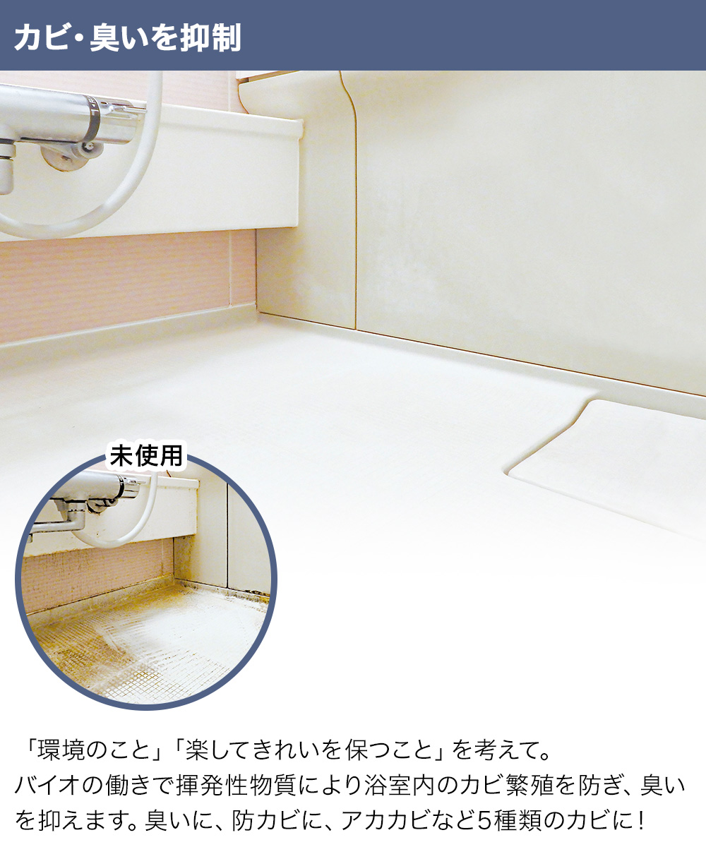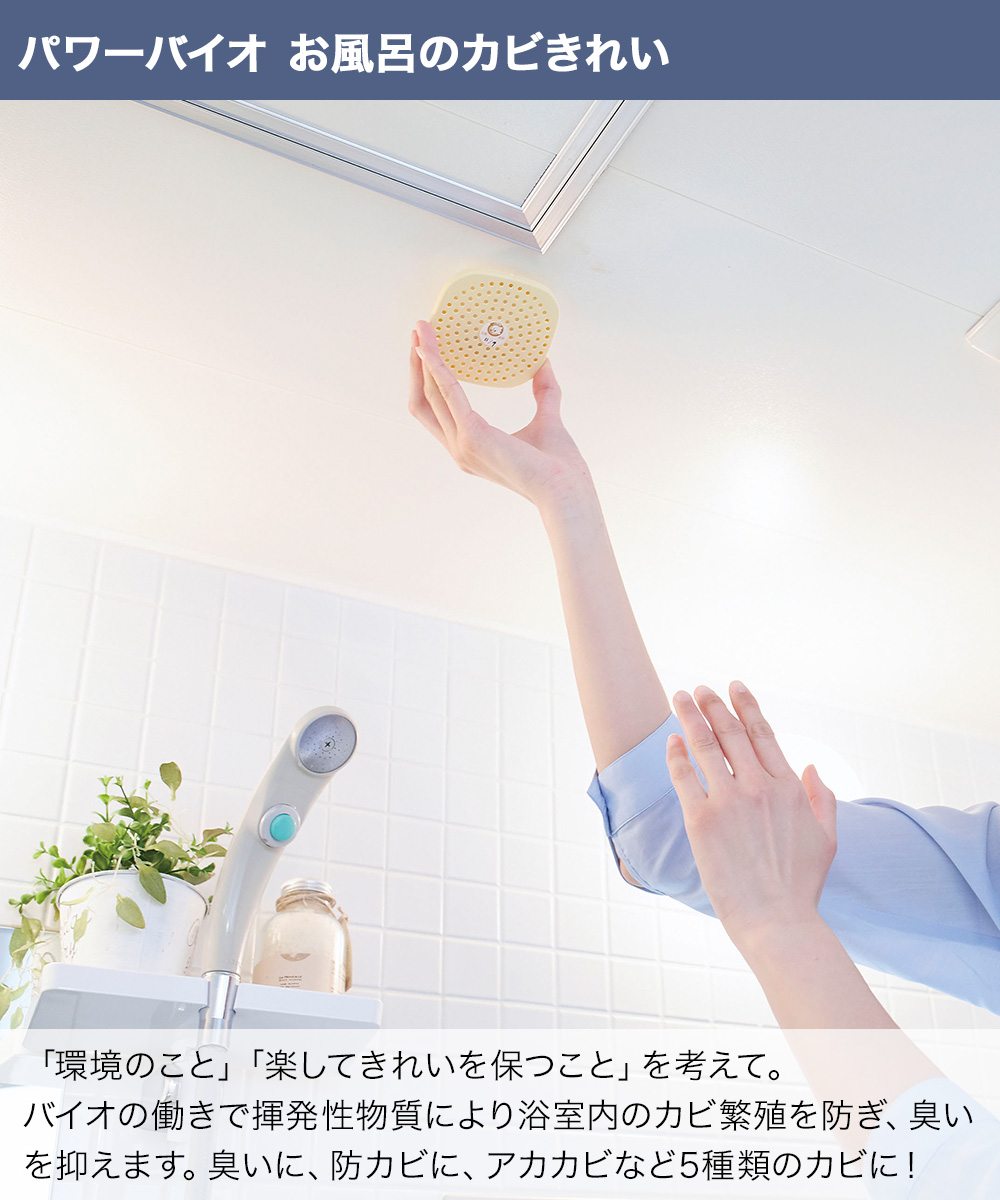 バイオの働きで揮発性物質により浴室内のカビの繁殖を防ぎ、臭いを抑えます。