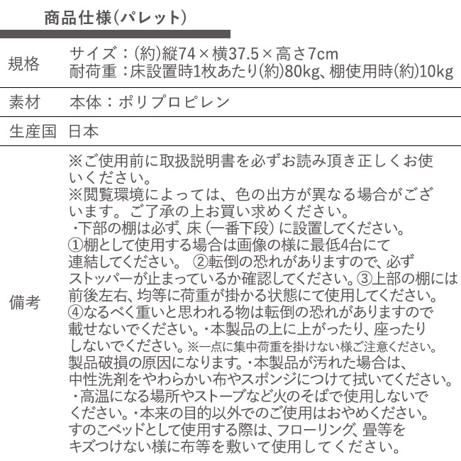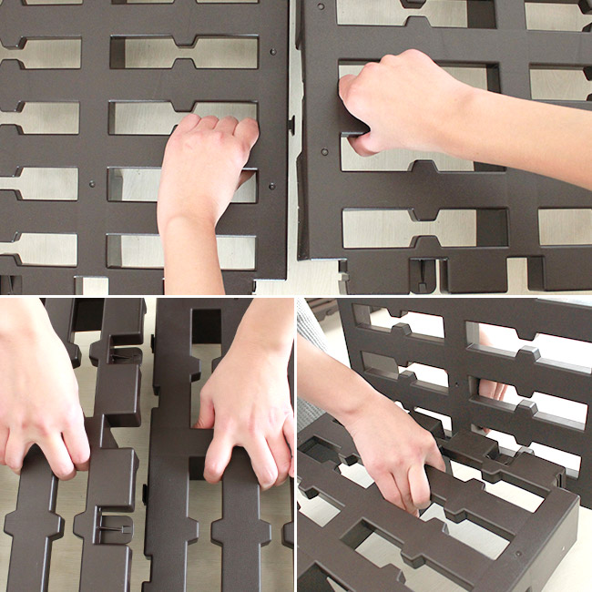 パレット同士は連結部分を差し込んで簡単に繋げられます。垂直に組む際は、すのこの穴に片方の本体端を差し込むとストッパーで止まります。