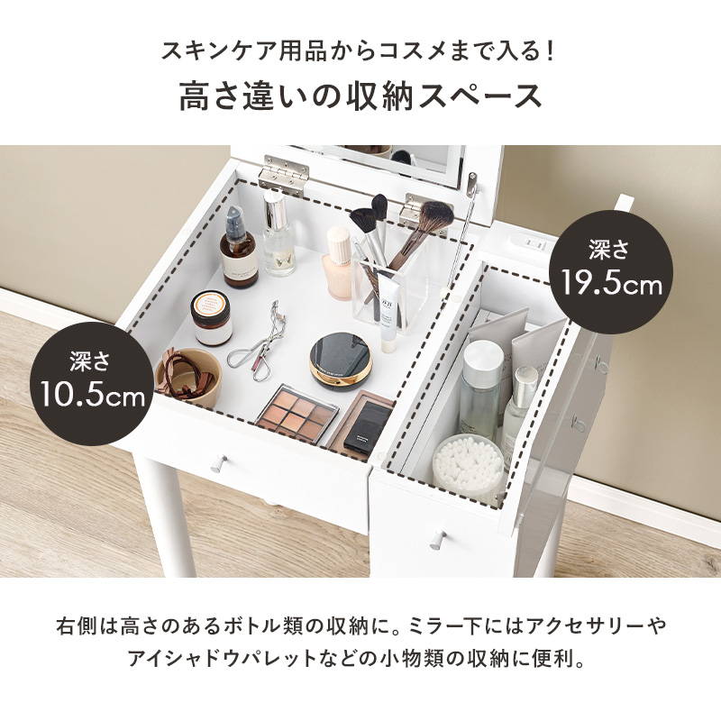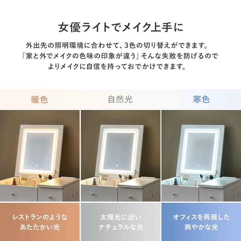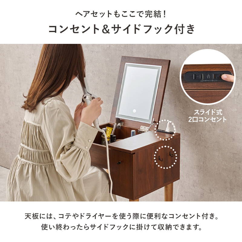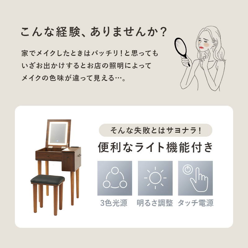 ドレッサーデスク スツールセット 幅51cm 机&椅子セット 天板裏ミラー LED 女優ライト 2口コンセント付き