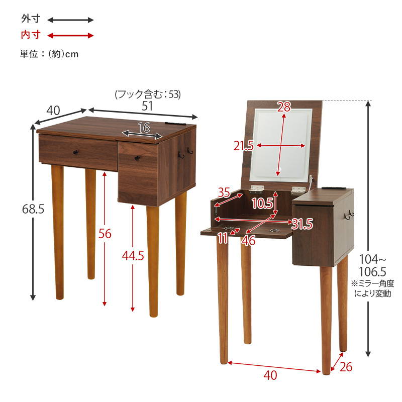 ドレッサー:(約)幅51(フック含:53)×奥行46〜65/40×高さ104〜106.5/68.5cm