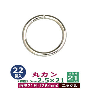 | 品 名:丸カン2.5×21【ニッケル】 サイズ:線径2.5mm 内径21mm 外寸26mm 材 質:鉄製 メッキ:ニッケル 詳 細:22個入1袋 加 工:溶接なし ◆丸カン 丸カンは、鉄線を曲げて加工した線材金具のことです。その名の通り丸い形をしたカン、円(輪)の形をした線材金具です。 ●丸カンをご使用時の注意点 ・丸カンを選ぶ際に、線の太さを表す「線径」、円の大きさを表す「内径」をご参考にお選びください。 ・線径とは、カンを形作る鉄線材の太さのことです。太ければ太いほどシッカリした仕上がりになり、負荷をかけても形が崩れません。 また、同じ内径でも線の太さによって、印象が変わりますので、金具を使う作品のイメージにあわせてお選びください。当店の丸カンは、鉄製です。主に服飾・雑貨の用途に使われるものを販売しておりますので、強度をお求めの方には不向きです。予めご了承ください。 ・丸カンは大きいものはベルトにしたり、鞄の取っ手部分の繋ぎ目に、小さいものはアクセサリーやストラップパーツとして多用されます。 その他雑貨小物などアイディア次第で広くお使いいただける商品です。 当店では各種サイズの他に、他店にはないメッキ加工を施したものもご用意しております。ニッケル(シルバー色)、アンティーク、ゴールド、ブラック等をご用意しております。ブラックには、 黒ニッケルとダークブラックがあり、黒ニッケルは金属特有の光沢ある黒色で、ダールブラックは光沢を潰したマッドな黒色になっています。 ●各種カンの大きさは下記です。 ・丸カンはコチラ ・二重カンはコチラ ・角カン・小カンはコチラ ・Dカン・月カンはコチラ ・ビラカンはコチラ ・ナスカンはコチラ ・手カンはコチラ ・リュックカン(一本線送り)はコチラ ・カニカンはコチラ ●各種カンお得セットは下記です。 ・小袋セット ・リーズナブルなお得セット ●その他、カシメ・ハトメは下記です。 ・カシメはコチラ ・ハトメはコチラ ■クラフト金具卸のカン金具 ・丸カン 円状の丸いカンです。大きいものから小さいものを集めました。 ・二重カン 二重カン・二重リングです。小さいものはキーホルダーやアクセサリー、ストラップなどに使われています。 ・角カン&小カン 縦:横の比率が大きくないタイプの四角いカンは、カバンや服飾雑貨に使われます。縦:横の比率が大きいタイプの長四角のカンは、カバンやベルト、ブレスレットに使われ、タルカンとも呼ばれます。 ・ビラカン 額縁の裏や、広告POP用金具として使われます。大カシメで止めてください。 ・Dカン&月カン カバンの肩紐などの長さ調節用などにも良く使われているDカンと月カン。各種サイズからお選びください。 ・ナスカン アクセサリーパーツやキーホルダー、カバン装飾具と広い用途で使われるナスカンです。 ・リュックカン(一本線送り)当店では一本線おくりと呼んでいる商品です。移動する線が真ん中にあり、紐調整金具として一般的な金具です。(関連商品:美錠) ・カニカン ストラップやキーホルダーなどに使われるカニカンとよばれる金具です。 |