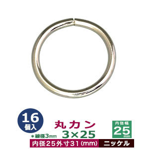 | 品 名:丸カン3×25【ニッケル】 サイズ:線径3mm 内径25m 外寸31mm 材 質:鉄製 メッキ:ニッケル 詳 細:16個入1袋 加 工:溶接なし ◆丸カン 丸カンは、鉄線を曲げて加工した線材金具のことです。その名の通り丸い形をしたカン、円(輪)の形をした線材金具です。 ●丸カンをご使用時の注意点 ・丸カンを選ぶ際に、線の太さを表す「線径」、円の大きさを表す「内径」をご参考にお選びください。 ・線径とは、カンを形作る鉄線材の太さのことです。太ければ太いほどシッカリした仕上がりになり、負荷をかけても形が崩れません。 また、同じ内径でも線の太さによって、印象が変わりますので、金具を使う作品のイメージにあわせてお選びください。当店の丸カンは、鉄製です。主に服飾・雑貨の用途に使われるものを販売しておりますので、強度をお求めの方には不向きです。予めご了承ください。 ・丸カンは大きいものはベルトにしたり、鞄の取っ手部分の繋ぎ目に、小さいものはアクセサリーやストラップパーツとして多用されます。 その他雑貨小物などアイディア次第で広くお使いいただける商品です。 当店では各種サイズの他に、他店にはないメッキ加工を施したものもご用意しております。ニッケル(シルバー色)、アンティーク、ゴールド、ブラック等をご用意しております。ブラックには、 黒ニッケルとダークブラックがあり、黒ニッケルは金属特有の光沢ある黒色で、ダールブラックは光沢を潰したマッドな黒色になっています。 ●各種カンの大きさは下記です。 ・丸カンはコチラ ・二重カンはコチラ ・角カン・小カンはコチラ ・Dカン・月カンはコチラ ・ビラカンはコチラ ・ナスカンはコチラ ・手カンはコチラ ・リュックカン(一本線送り)はコチラ ・カニカンはコチラ ●各種カンお得セットは下記です。 ・小袋セット ・リーズナブルなお得セット ●その他、カシメ・ハトメは下記です。 ・カシメはコチラ ・ハトメはコチラ ■クラフト金具卸のカン金具 ・丸カン 円状の丸いカンです。大きいものから小さいものを集めました。 ・二重カン 二重カン・二重リングです。小さいものはキーホルダーやアクセサリー、ストラップなどに使われています。 ・角カン&小カン 縦:横の比率が大きくないタイプの四角いカンは、カバンや服飾雑貨に使われます。縦:横の比率が大きいタイプの長四角のカンは、カバンやベルト、ブレスレットに使われ、タルカンとも呼ばれます。 ・ビラカン 額縁の裏や、広告POP用金具として使われます。大カシメで止めてください。 ・Dカン&月カン カバンの肩紐などの長さ調節用などにも良く使われているDカンと月カン。各種サイズからお選びください。 ・ナスカン アクセサリーパーツやキーホルダー、カバン装飾具と広い用途で使われるナスカンです。 ・リュックカン(一本線送り)当店では一本線おくりと呼んでいる商品です。移動する線が真ん中にあり、紐調整金具として一般的な金具です。(関連商品:美錠) ・カニカン ストラップやキーホルダーなどに使われるカニカンとよばれる金具です。 |