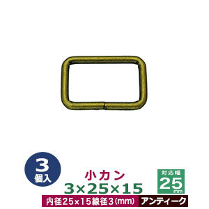 | 品 名:小カン3×25×15【アンティーク】 サイズ:線径3mm 内径25×15mm 材 質:鉄製 メッキ:アンティーク 詳 細:3個入1袋 加 工:溶接なし ◆角カン・小カン 角カン・小カンは、鉄線を曲げて加工し四角い形を作った線材金具です。 角カンとは、その名の通り四角い形をしたカンです。縦と横の比率が小さい、ズングリした印象をうける四角のカンです。小カンは角カンに比べると、縦横の比率が大きく平べったい印象のある四角環です。 角カン・小カンをご使用時の注意点 ・角カン・小カンを選ぶ際に、線の太さを表す「線径」、大きさを表す「内径」をご参考にお選びください。 ・線径とは、カンを形作る鉄線材の太さのことです。太ければ太いほどシッカリした仕上がりになり、負荷をかけても形が崩れません。 また、同じ内径でも線の太さによって、印象が変わりますので、金具を使う作品のイメージにあわせてお選びください。当店の角カン・小カンは、鉄製です。主に服飾・雑貨の用途に使われるものを販売しておりますので、強度をお求めの方には不向きです。予めご了承ください。 ●各種カンの大きさは下記です。 ・丸カンはコチラ ・二重カンはコチラ ・角カン・小カンはコチラ ・Dカン・月カンはコチラ ・ビラカンはコチラ ・ナスカンはコチラ ・手カンはコチラ ・リュックカン(一本線送り)はコチラ ・カニカンはコチラ ●各種カンお得セットは下記です。 ・小袋セット ・リーズナブルなお得セット ●その他、カシメ・ハトメは下記です。 ・カシメはコチラ ・ハトメはコチラ ■クラフト金具卸のカン金具 ・丸カン 円状の丸いカンです。大きいものから小さいものを集めました。 ・二重カン 二重カン・二重リングです。小さいものはキーホルダーやアクセサリー、ストラップなどに使われています。 ・角カン&小カン 縦:横の比率が大きくないタイプの四角いカンは、カバンや服飾雑貨に使われます。縦:横の比率が大きいタイプの長四角のカンは、カバンやベルト、ブレスレットに使われ、タルカンとも呼ばれます。 ・ビラカン 額縁の裏や、広告POP用金具として使われます。大カシメで止めてください。 ・Dカン&月カン カバンの肩紐などの長さ調節用などにも良く使われているDカンと月カン。各種サイズからお選びください。 ・ナスカン アクセサリーパーツやキーホルダー、カバン装飾具と広い用途で使われるナスカンです。 ・リュックカン(一本線送り)当店では一本線おくりと呼んでいる商品です。移動する線が真ん中にあり、紐調整金具として一般的な金具です。(関連商品:美錠) ・カニカン ストラップやキーホルダーなどに使われるカニカンとよばれる金具です。 |