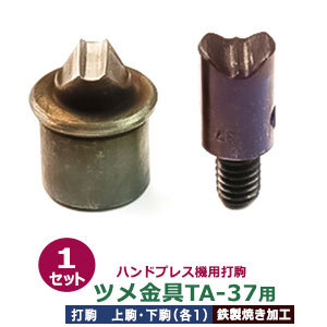 | 品 名:ハンドプレス打駒【ツメ金具TA-37用】 サイズ:上駒 幅13.5mm高32.0mm軸幅7.9mm :下駒 幅22mm高25mm軸幅19mm 材 質:鉄製 詳 細:上駒1下駒1 2パーツ1セット入 *お断りなく仕様が変更になる場合があります ご注意ください:お手持ちのハンドプレス機によっては、 合わない場合もございます。また、工具類は消耗品のため 開封・未開封に関わらず返品交換いたしかねますので、 ご確認の上、ご購入ください。 当店の工具類は、当店の金具に合わせて作っております。 ご使用の際には、当店の金具をご利用ください。 ●クラフト金具卸のハンドプレス機用打駒 ツメ金具用 紐止めツメ金具をハンドプレス機で取り付けるための打駒です。 ツメ金具は、細くて小さい金具ですが、ハンドプレス機を使うことでシッカリ巻き込み式のきれいな仕上がりとなります。 左右が対象で丸く仕上がる「巻き込み式」の打駒です。打駒とはハンドプレスの治具とも言います。 ツメ金具はペンチを使って留めることができますが、ハンドプレス機に本製品を取付けて使うことで無限のマーク(∞)に近い形状で仕上げることができます。 ●ハンドプレス機でのツメ金具の打ち方・ご注意 1.ハンドプレス機にツメ金具用打駒をセットします。 ハトメ・カシメ打駒とちがい、ツメは点対象の形状ではないため、 レバーを振り下ろしたときに上駒と下駒がガチッと噛み合う用にセットしてください。 2.下駒に紐を通したツメを乗せます。真ん中に、ゴムや紐を押し込めます。 3.ゴム・紐等と金具をセットしたら、上駒をグッと押し込めます。 ハンドプレス機打駒は、ツメ金具を乗せたときにピッタリの形状になるよう造られています。 手応えがしたらレバーを引き上げてください。ツメ金具が丸く折りたたまれてています。 髪留めなどの通常使用ならば十分ご利用いただけますが、「抜け」ない保証はございませんので、必ずご使用の際に強度をご確認いただきますようお願いします。 ●ハンドプレス機は下記です。 ・ハンドプレス機 ●ハンドプレス機打駒は下記です。 ・各種打駒 ●プロ用手打ち工具は下記です。 ・プロ用手打ち工具 ●ホックの大きさは下記です。 ・バネホックはコチラ ・ジャンパーホックはコチラ ・カギホックはコチラ ・ヘリドメホックはコチラ ・マグネットホックはコチラ ・アメリカンホックはコチラ ■クラフト金具卸のハンドプレス打駒 小型のハンドプレス機にセットし、金具に圧力をかけ、取り付けるための先端用部品工具です。上駒と下駒のセットを打駒と呼び、カシメやハトメ、ホックなどの金具にあわせて打駒をご用意しています。 ハンドプレス機を使用すると、力にない方でも比較的簡単で綺麗にハトメなどの金具を取り付けられます。 ●クラフト金具卸のハンドプレス打駒アメリカンホック用 ハンドプレス機をお持ちで、頭径10mmのアメリカンホックを取り付けたいなら、このパーツ。 「打駒アメリカンホック」は、手作業ではうまく打てないホックの取り付けを簡単にしてくれる便利な工具です。お持ちのハンドプレス機にセットするだけで失敗ロス少なく、静かにホックの取り付けすることが可能となります。アメリカンホックの打駒は、3つ組のホックにあわせて3パーツに分かれており、上型、下型、ツメの各パーツに対応します。また、当店の打駒アメリカンホック用は、当店販売のアメリカンホックに合せております。ご使用の際には、当店のアメリカンホックをご利用ください。 |