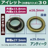| 足の種類:座金あり 品 名:アイレット30【アンティーク】ブロンズ サイズ:内径15mm 傘径28mm高9mm 材 質:真鍮 表面処理:アンティーク塗装 詳 細:3セット入1袋 ご注意ください:お手持ちの工具によっては、 合わない場合もございます。 ●ハトメの大きさは下記です。 ・かけるのハトメはコチラ ・ハトメはコチラ ・両面ハトメはコチラ ・アイレットはコチラ ●ハトメお得セットは下記です。 ・小袋セット ・リーズナブルなお得セット ■クラフト金具卸のハトメ金具 ハトメは、鳩目とも書き、布・革・シート・紙に等あけた穴の補強具として使われます。 補強しようと思う穴の大きさからハトメの内径を選び、布や紙・革の取り付ける物の合計厚みからハトメの高さをお選びください。 特にハトメの「高さ」については、取り付ける物の合計の厚みにプラス+2mm〜3mmした高さを持つハトメを選ばなければ止まりません。 例:高さ5mmのハトメは革・布の厚み合計が3mmないし2mmのものに適します。ただし、材質により止まり具合は異なりますのでご確認ください。 アイレットは、ハトメの大きなものを言い、カーテンのホール、建設現場のテント、シートのロープ通し用の穴などに使われています。 ●当店では、真鍮製のハトメとアルミ製、ステンレス製のハトメを扱っております。 真鍮製のハトメは、安価な鉄製のハトメと違い、鉄錆を始めとする腐食に強いのが特徴です。アルミ製は、真鍮よりも柔らかく軽い仕上がりになります。 ●ハトメの取り付け方 1.ハトメ抜き・穴あけポンチと呼ばれる工具でハトメの足を通す穴(ほぼ内径と同寸法の穴)をあける。 2.その穴にハトメの足を通し、革(布など)を挟む形でハトメ座をあてます。 3.最後にハトメ足を潰します。ハトメ足を潰すには、A.手打棒と皿で手打ちするかB.専用の駒をセットしたハンドプレスで足を潰す2種類の方法があります。手打ち棒と皿で打つ場合は、制作する方の熟達度合いによっても仕上がりは異なります。力の弱い方は、手打ち工具よりもハンドプレス機をおすすめします。 |