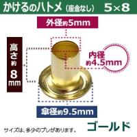 | 足の種類:座金なし本体のみ 品 名:かけるのハトメ5X8【ゴールド】 サイズ:外径5mm 高8mm 内径4.5mm 傘径9.5mm 材 質:真鍮 表面処理:『キリンス処理』 *酸洗いで真鍮本来の色を生かした処理をしています。 表面に黒い斑点が残る場合があります。 商品の色は、ロットごとに異なり画像と違う場合があります。 詳 細:8コ入り1袋 ・ハトメ5X8の特徴 ハトメの穴を内側から測った径:内径4.5mmが、ハトメ300に非常に近い寸法の電気ハトメです。 ハトメ300と同じ工具が使えます。また、ハトメ300足長では、長さが足りなかった場合の代替品 ハトメ300超足長として使われることもあります。*ご注意*工具は、ハトメ300片面用をご使用ください。両面用の工具で打つとハトメが割れます。 使用例として複数枚重ねた木材板を留める、樹脂製ボードの固定や圧着用などで広くご利用いただいています。 ハトメ5×8やハトメ5×10は、日用雑貨用のハトメ300とは異なる電気ハトメですので「座金」と呼ばれる輪っか(ワッシャー)が付属されていません。座金が必要な場合は別途ハトメ300をお買い求めいただき、ハトメ300の座金をつけてお使いください。 また、本体の生地となる真鍮の色をそのまま生かしたキリンス処理によるゴールド色ののみお取扱いしております。 取り付ける際のご注意:高さが8mmですので取り付け対象の厚み合計が6.5mmよりも薄いものにお使いください。 通常、ハトメは取付ける対象となる布や革の合計厚みよりも2~3mm長い高さのものをお勧めしていますが、電気ハトメの場合は座金なしで使うため-1mm程度迄でもカバーします。取り付ける際には、必ず厚さを実測してご確認ください。 ●ハトメの大きさは下記です。 ・かけるのハトメはコチラ ・ハトメはコチラ ・両面ハトメはコチラ ・アイレットはコチラ ●ハトメお得セットは下記です。 ・小袋セット ・リーズナブルなお得セット ■クラフト金具卸のハトメ金具 ハトメは、鳩目とも書き、布・革・シート・紙に等あけた穴の補強具として使われます。 補強しようと思う穴の大きさからハトメの内径を選び、布や紙・革の取り付ける物の合計厚みからハトメの高さをお選びください。 特にハトメの「高さ」については、取り付ける物の合計の厚みにプラス+2mm〜3mmした高さを持つハトメを選ばなければ止まりません。 例:高さ5mmのハトメは革・布の厚み合計が3mmないし2mmのものに適します。ただし、材質により止まり具合は異なりますのでご確認ください。 アイレットは、ハトメの大きなものを言い、カーテンのホール、建設現場のテント、シートのロープ通し用の穴などに使われています。 ●当店では、真鍮製のハトメとアルミ製、ステンレス製のハトメを扱っております。 真鍮製のハトメは、安価な鉄製のハトメと違い、鉄錆を始めとする腐食に強いのが特徴です。アルミ製は、真鍮よりも柔らかく軽い仕上がりになります。 ●ハトメの取り付け方 1.ハトメ抜き・穴あけポンチと呼ばれる工具でハトメの足を通す穴(ほぼ内径と同寸法の穴)をあける。 2.その穴にハトメの足を通し、革(布など)を挟む形でハトメ座をあてます。 3.最後にハトメ足を潰します。ハトメ足を潰すには、A.手打棒と皿で手打ちするかB.専用の駒をセットしたハンドプレスで足を潰す2種類の方法があります。手打ち棒と皿で打つ場合は、制作する方の熟達度合いによっても仕上がりは異なります。力の弱い方は、手打ち工具よりもハンドプレス機をおすすめします。 |