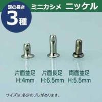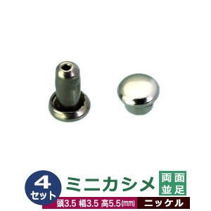| 足の種類:両面並足 品 名:ミニカシメ【シルバー】ニッケル サイズ:頭3.5mm 幅3.5mm 高5.5mm 材 質:真鍮 メッキ:ニッケルメッキ加工 詳 細:4セット(頭 足 各4)入り1袋 専用の工具(手打ち棒かハンドプレス)で上からしっかりと叩いてください。 ■カシメを選ぶときの目安 1.カシメ頭の大きさを選ぶ カシメの種類によって、頭の大きさが違います。 (ミニカシメ、特小カシメ、 小カシメ、中カシメ、 大カシメ、特大カシメ) 2.カシメ足の(両面/片面)を選ぶ カシメの足には「両面」「片面」があり、裏面の外観が異なります。 【片面カシメの場合】裏面(表出する金具部分)がドーナッツのように穴があきます。厚みがあまり出ないため、平たく仕上げたい時に使います。 【両面カシメの場合】裏面(表出する金具部分)が丸みを帯びた丸釦で表面と同じ様に仕上ります。やや厚みが出ます。 3.カシメ足の長さを選ぶ 取り付ける布や革の厚みによって「短足」「並足」「長足」と足の長さをお選びください。 【片面カシメの場合】 取り付ける革(布)の厚み合計+2mm=最適なカシメの足の長さ 【両面カシメの場合】 取り付ける革(布)の厚み合計+3mm=最適なカシメの足の長さ ●カシメの大きさは下記です。 ・ミニカシメはコチラ ・特小カシメはコチラ ・小カシメはコチラ ・中カシメはコチラ ・大カシメはコチラ ・特大カシメはコチラ ●カシメお得セットは下記です。 ・小袋セット ・リーズナブルなお得セット ●その他カシメは下記です。 ・飾りカシメはコチラ ・ライトストーンはコチラ ・ターコイズはコチラ ・底鋲半丸カシメはコチラ ■クラフト金具卸のカシメ金具 カシメは頭(メス)と足(オス)で一対、布や革を止める金具です。 布や革に、カシメの足を通る穴(多くは2mmないし3mm)をあけ、挟みこむようにして頭をかぶせ、足を潰してカシメをとめます。 リベットやハトメと違い、カシメは足がクルッとヒックリ返るわけではありません。 被せた頭の中で足がグシャッと潰れ止まっています。 「カシメがすぐ外れます」とのご質問いただくことがありますが、それはカシメている(足を潰している)のではなく、ただ挟んで頭を被せているだけの状態だからです。 足が潰れていない状態は「カシメている」になりません。 専用の工具(手打ち棒かハンドプレス)で上からしっかりと叩いてください。 |