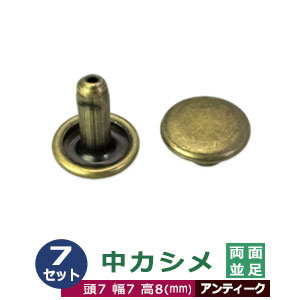 | 足の種類:両面並足 品 名:中カシメ 両面並足 7mm【アンティーク】ブロンズ サイズ:頭7mm 幅7mm 高8mm 材 質:真鍮 メッキ:アンティーク塗装加工 詳 細:7セット(頭 足 各7)入り1袋 頭の直径が7mmの使いやすいサイズの中カシメです。 両面足ですので、裏表同じように仕上がります。取付けた際には革の表側には7mmの頭、革の裏側には7mmの足傘(頭と同じような形)が出ます。 足傘含めた足の長さが8mmですので、合計厚み5mm程度の布や革に最適です。 ■カシメを選ぶときの目安 1.カシメ頭の大きさを選ぶ カシメの種類によって、頭の大きさが違います。 (ミニカシメ、特小カシメ、 小カシメ、中カシメ、 大カシメ、特大カシメ) 2.カシメ足の(両面/片面)を選ぶ カシメの足には「両面」「片面」があり、裏面の外観が異なります。 【片面カシメの場合】裏面(表出する金具部分)がドーナッツのように穴があきます。厚みがあまり出ないため、平たく仕上げたい時に使います。 【両面カシメの場合】裏面(表出する金具部分)が丸みを帯びた丸釦で表面と同じ様に仕上ります。やや厚みが出ます。 3.カシメ足の長さを選ぶ 取り付ける布や革の厚みによって「短足」「並足」「長足」と足の長さをお選びください。 【片面カシメの場合】 取り付ける革(布)の厚み合計+2mm=最適なカシメの足の長さ 【両面カシメの場合】 取り付ける革(布)の厚み合計+3mm=最適なカシメの足の長さ ●カシメの大きさは下記です。 ・ミニカシメはコチラ ・特小カシメはコチラ ・小カシメはコチラ ・中カシメはコチラ ・大カシメはコチラ ・特大カシメはコチラ ●カシメお得セットは下記です。 ・小袋セット ・リーズナブルなお得セット ●その他カシメは下記です。 ・飾りカシメはコチラ ・ライトストーンはコチラ ・ターコイズはコチラ ・底鋲半丸カシメはコチラ ■クラフト金具卸のカシメ金具 カシメは頭(メス)と足(オス)で一対、布や革を止める金具です。 布や革に、カシメの足を通る穴(多くは2mmないし3mm)をあけ、挟みこむようにして頭をかぶせ、足を潰してカシメをとめます。 リベットやハトメと違い、カシメは足がクルッとヒックリ返るわけではありません。 被せた頭の中で足がグシャッと潰れ止まっています。 「カシメがすぐ外れます」とのご質問いただくことがありますが、それはカシメている(足を潰している)のではなく、ただ挟んで頭を被せているだけの状態だからです。 足が潰れていない状態は「カシメている」になりません。 専用の工具(手打ち棒かハンドプレス)で上からしっかりと叩いてください。 |