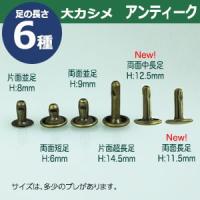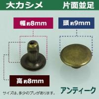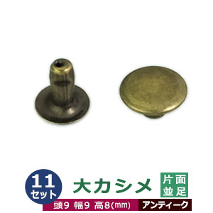 | 足の種類:片面並足 品 名:大カシメ 9mm 片面 並足 【アンティーク】ブロンズ サイズ:頭9mm 幅9mm 高8mm 材 質:真鍮 表面処理:アンティーク塗装 詳 細:11セット(頭 足 各11)入り1袋 頭・直径が9mmのスタンダードな大きめのカシメです。 片面ですので、取付けた際には革の表面に9mm径のカシメ頭が、革の裏面には7.5mm径の丸い穴の開いた足傘が出ます。 片面カシメの足傘は穴は開いていますが、平たい形状になっており厚みはなく、カシメ頭と異なります。 裏表同じようには仕上がりませんので、同じように仕上げたい場合は大カシメ両面並足をお使いください。足の長さは、標準的な片面並足8mmですので、革や布の合計の厚みが6〜5mm程度の布や革にご使用ください。 ■カシメを選ぶときの目安 1.カシメ頭の大きさを選ぶ カシメの種類によって、頭の大きさが違います。 (ミニカシメ、特小カシメ、 小カシメ、中カシメ、 大カシメ、特大カシメ) 2.カシメ足の(両面/片面)を選ぶ カシメの足には「両面」「片面」があり、裏面の外観が異なります。 【片面カシメの場合】裏面(表出する金具部分)がドーナッツのように穴があきます。厚みがあまり出ないため、平たく仕上げたい時に使います。 【両面カシメの場合】裏面(表出する金具部分)が丸みを帯びた丸釦で表面と同じ様に仕上ります。やや厚みが出ます。 3.カシメ足の長さを選ぶ 取り付ける布や革の厚みによって「短足」「並足」「長足」と足の長さをお選びください。 【片面カシメの場合】 取り付ける革(布)の厚み合計+2mm=最適なカシメの足の長さ 【両面カシメの場合】 取り付ける革(布)の厚み合計+3mm=最適なカシメの足の長さ ●カシメの大きさは下記です。 ・ミニカシメはコチラ ・特小カシメはコチラ ・小カシメはコチラ ・中カシメはコチラ ・大カシメはコチラ ・特大カシメはコチラ ●カシメお得セットは下記です。 ・小袋セット ・リーズナブルなお得セット ●その他カシメは下記です。 ・飾りカシメはコチラ ・ライトストーンはコチラ ・ターコイズはコチラ ・底鋲半丸カシメはコチラ ■クラフト金具卸のカシメ金具 カシメは頭(メス)と足(オス)で一対、布や革を止める金具です。 布や革に、カシメの足を通る穴(多くは2mmないし3mm)をあけ、挟みこむようにして頭をかぶせ、足を潰してカシメをとめます。 リベットやハトメと違い、カシメは足がクルッとヒックリ返るわけではありません。 被せた頭の中で足がグシャッと潰れ止まっています。 「カシメがすぐ外れます」とのご質問いただくことがありますが、それはカシメている(足を潰している)のではなく、ただ挟んで頭を被せているだけの状態だからです。 足が潰れていない状態は「カシメている」になりません。 専用の工具(手打ち棒かハンドプレス)で上からしっかりと叩いてください。 |