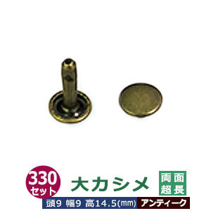 | 足の種類:両面超長足 品 名:大カシメ サイズ:頭9mm 幅9mm 高14.5mm 材 質:鉄製 メッキ:アンティーク 詳 細:330セット入り1袋 ■カシメを選ぶときの目安 1.カシメ頭の大きさを選ぶ カシメの種類によって、頭の大きさが違います。 (ミニカシメ、特小カシメ、 小カシメ、中カシメ、 大カシメ、特大カシメ) 2.カシメ足の(両面/片面)を選ぶ カシメの足には「両面」「片面」があり、裏面の外観が異なります。 【片面カシメの場合】裏面(表出する金具部分)がドーナッツのように穴があきます。厚みがあまり出ないため、平たく仕上げたい時に使います。 【両面カシメの場合】裏面(表出する金具部分)が丸みを帯びた丸釦で表面と同じ様に仕上ります。やや厚みが出ます。 3.カシメ足の長さを選ぶ 取り付ける布や革の厚みによって「短足」「並足」「長足」と足の長さをお選びください。 【片面カシメの場合】 取り付ける革(布)の厚み合計+2mm=最適なカシメの足の長さ 【両面カシメの場合】 取り付ける革(布)の厚み合計+3mm=最適なカシメの足の長さ ●カシメの大きさは下記です。 ・ミニカシメはコチラ ・特小カシメはコチラ ・小カシメはコチラ ・中カシメはコチラ ・大カシメはコチラ ・特大カシメはコチラ ●カシメお得セットは下記です。 ・小袋セット ・リーズナブルなお得セット ●その他カシメは下記です。 ・飾りカシメはコチラ ・ライトストーンはコチラ ・ターコイズはコチラ ・底鋲半丸カシメはコチラ ■クラフト金具卸のカシメ金具 カシメは頭(メス)と足(オス)で一対、布や革を止める金具です。 布や革に、カシメの足を通る穴(多くは2mmないし3mm)をあけ、挟みこむようにして頭をかぶせ、足を潰してカシメをとめます。 リベットやハトメと違い、カシメは足がクルッとヒックリ返るわけではありません。 被せた頭の中で足がグシャッと潰れ止まっています。 「カシメがすぐ外れます」とのご質問いただくことがありますが、それはカシメている(足を潰している)のではなく、ただ挟んで頭を被せているだけの状態だからです。 足が潰れていない状態は「カシメている」になりません。 専用の工具(手打ち棒かハンドプレス)で上からしっかりと叩いてください。 |