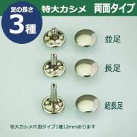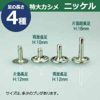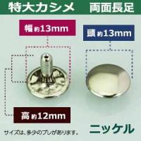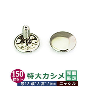 | 足の種類:両面長足 品 名:特大カシメ サイズ:頭13mm 幅13mm 高10mm 材 質:真鍮 メッキ:ニッケル 詳 細:150セット入り1袋 ■カシメを選ぶときの目安 1.カシメ頭の大きさを選ぶ カシメの種類によって、頭の大きさが違います。 (ミニカシメ、特小カシメ、 小カシメ、中カシメ、 大カシメ、特大カシメ) 2.カシメ足の(両面/片面)を選ぶ カシメの足には「両面」「片面」があり、裏面の外観が異なります。 【片面カシメの場合】裏面(表出する金具部分)がドーナッツのように穴があきます。厚みがあまり出ないため、平たく仕上げたい時に使います。 【両面カシメの場合】裏面(表出する金具部分)が丸みを帯びた丸釦で表面と同じ様に仕上ります。やや厚みが出ます。 3.カシメ足の長さを選ぶ 取り付ける布や革の厚みによって「短足」「並足」「長足」と足の長さをお選びください。 【片面カシメの場合】 取り付ける革(布)の厚み合計+2mm=最適なカシメの足の長さ 【両面カシメの場合】 取り付ける革(布)の厚み合計+3mm=最適なカシメの足の長さ ●カシメの大きさは下記です。 ・ミニカシメはコチラ ・特小カシメはコチラ ・小カシメはコチラ ・中カシメはコチラ ・大カシメはコチラ ・特大カシメはコチラ ●カシメお得セットは下記です。 ・小袋セット ・リーズナブルなお得セット ●その他カシメは下記です。 ・飾りカシメはコチラ ・ライトストーンはコチラ ・ターコイズはコチラ ・底鋲半丸カシメはコチラ ■クラフト金具卸のカシメ金具 カシメは頭(メス)と足(オス)で一対、布や革を止める金具です。 布や革に、カシメの足を通る穴(多くは2mmないし3mm)をあけ、挟みこむようにして頭をかぶせ、足を潰してカシメをとめます。 リベットやハトメと違い、カシメは足がクルッとヒックリ返るわけではありません。 被せた頭の中で足がグシャッと潰れ止まっています。 「カシメがすぐ外れます」とのご質問いただくことがありますが、それはカシメている(足を潰している)のではなく、ただ挟んで頭を被せているだけの状態だからです。 足が潰れていない状態は「カシメている」になりません。 専用の工具(手打ち棒かハンドプレス)で上からしっかりと叩いてください。 |
