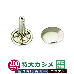 | 足の種類:両面超長足 品 名:特大カシメ サイズ:頭13mm 幅13mm 高18mm 材 質:鉄製 メッキ:ニッケル 詳 細:200セット入り1袋 ■カシメを選ぶときの目安 1.カシメ頭の大きさを選ぶ カシメの種類によって、頭の大きさが違います。 (ミニカシメ、特小カシメ、 小カシメ、中カシメ、 大カシメ、特大カシメ) 2.カシメ足の(両面/片面)を選ぶ カシメの足には「両面」「片面」があり、裏面の外観が異なります。 【片面カシメの場合】裏面(表出する金具部分)がドーナッツのように穴があきます。厚みがあまり出ないため、平たく仕上げたい時に使います。 【両面カシメの場合】裏面(表出する金具部分)が丸みを帯びた丸釦で表面と同じ様に仕上ります。やや厚みが出ます。 3.カシメ足の長さを選ぶ 取り付ける布や革の厚みによって「短足」「並足」「長足」と足の長さをお選びください。 【片面カシメの場合】 取り付ける革(布)の厚み合計+2mm=最適なカシメの足の長さ 【両面カシメの場合】 取り付ける革(布)の厚み合計+3mm=最適なカシメの足の長さ > ●カシメの大きさは下記です。 ・ミニカシメはコチラ ・特小カシメはコチラ ・小カシメはコチラ ・中カシメはコチラ ・大カシメはコチラ ・特大カシメはコチラ ●カシメお得セットは下記です。 ・小袋セット ・リーズナブルなお得セット ●その他カシメは下記です。 ・飾りカシメはコチラ ・ライトストーンはコチラ ・ターコイズはコチラ ・底鋲半丸カシメはコチラ ■クラフト金具卸のカシメ金具 カシメは頭(メス)と足(オス)で一対、布や革を止める金具です。 布や革に、カシメの足を通る穴(多くは2mmないし3mm)をあけ、挟みこむようにして頭をかぶせ、足を潰してカシメをとめます。 リベットやハトメと違い、カシメは足がクルッとヒックリ返るわけではありません。 被せた頭の中で足がグシャッと潰れ止まっています。 「カシメがすぐ外れます」とのご質問いただくことがありますが、それはカシメている(足を潰している)のではなく、ただ挟んで頭を被せているだけの状態だからです。 足が潰れていない状態は「カシメている」になりません。 専用の工具(手打ち棒かハンドプレス)で上からしっかりと叩いてください。 |