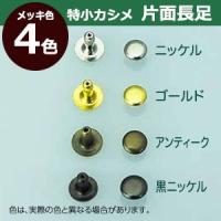 | 足の種類:片面長足 品 名:特小カシメ【ブラック】黒ニッケル サイズ:頭4.6mm 幅6mm 高6mm 材 質:真鍮 メッキ:黒ニッケルメッキ加工 詳 細:300セット(頭足 各300)入り1袋 専用の工具(手打ち棒かハンドプレス)で上からしっかりと叩いてください。 ■カシメを選ぶときの目安 1.カシメ頭の大きさを選ぶ カシメの種類によって、頭の大きさが違います。 (ミニカシメ、特小カシメ、 小カシメ、中カシメ、 大カシメ、特大カシメ) 2.カシメ足の(両面/片面)を選ぶ カシメの足には「両面」「片面」があり、裏面の外観が異なります。 【片面カシメの場合】裏面(表出する金具部分)がドーナッツのように穴があきます。厚みがあまり出ないため、平たく仕上げたい時に使います。 【両面カシメの場合】裏面(表出する金具部分)が丸みを帯びた丸釦で表面と同じ様に仕上ります。やや厚みが出ます。 3.カシメ足の長さを選ぶ 取り付ける布や革の厚みによって「短足」「並足」「長足」と足の長さをお選びください。 【片面カシメの場合】 取り付ける革(布)の厚み合計+2mm=最適なカシメの足の長さ 【両面カシメの場合】 取り付ける革(布)の厚み合計+3mm=最適なカシメの足の長さ ●カシメの大きさは下記です。 ・ミニカシメはコチラ ・特小カシメはコチラ ・小カシメはコチラ ・中カシメはコチラ ・大カシメはコチラ ・特大カシメはコチラ ●カシメお得セットは下記です。 ・小袋セット ・リーズナブルなお得セット ●その他カシメは下記です。 ・飾りカシメはコチラ ・ライトストーンはコチラ ・ターコイズはコチラ ・底鋲半丸カシメはコチラ ■クラフト金具卸のカシメ金具 カシメは頭(メス)と足(オス)で一対、布や革を止める金具です。 布や革に、カシメの足を通る穴(多くは2mmないし3mm)をあけ、挟みこむようにして頭をかぶせ、足を潰してカシメをとめます。 リベットやハトメと違い、カシメは足がクルッとヒックリ返るわけではありません。 被せた頭の中で足がグシャッと潰れ止まっています。 「カシメがすぐ外れます」とのご質問いただくことがありますが、それはカシメている(足を潰している)のではなく、ただ挟んで頭を被せているだけの状態だからです。 足が潰れていない状態は「カシメている」になりません。 専用の工具(手打ち棒かハンドプレス)で上からしっかりと叩いてください。 |