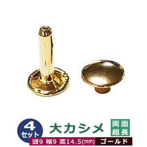 | 足の種類:両面超長足 品 名:大カシメ 両面超長足【ゴールド】本金メッキ サイズ:頭9mm 幅9mm 高14.5mm 材 質:鉄製 メッキ:本金メッキ加工 詳 細:4セット(頭・本体各4)入り1袋 12mm近くの厚いものに使える超足長タイプの大カシメです。 足の長さは約14.5mmですので、革や布の合計厚みが11.5mm程度のものであれば使用可能です。 足傘の厚みを抜いた純粋な足軸の長さは約13mm近くとなっております。また足傘の幅は、頭と同じ直径9mmの両面足ですから、裏表ともに直径9mmの丸みのある頭が出ます。 裏表を同じように仕上げることができます。足の軸径は、他の大カシメと同じく約3mmとなっていますので、実際の取り付け時にはハトメ抜き4mm等をつかって4mmの穴を開けてください。 工具は大カシメ両面用を共通してお使いいただけます。 ■カシメを選ぶときの目安 1.カシメ頭の大きさを選ぶ カシメの種類によって、頭の大きさが違います。 (ミニカシメ、特小カシメ、 小カシメ、中カシメ、 大カシメ、特大カシメ) 2.カシメ足の(両面/片面)を選ぶ カシメの足には「両面」「片面」があり、裏面の外観が異なります。 【片面カシメの場合】裏面(表出する金具部分)がドーナッツのように穴があきます。厚みがあまり出ないため、平たく仕上げたい時に使います。 【両面カシメの場合】裏面(表出する金具部分)が丸みを帯びた丸釦で表面と同じ様に仕上ります。やや厚みが出ます。 3.カシメ足の長さを選ぶ 取り付ける布や革の厚みによって「短足」「並足」「長足」と足の長さをお選びください。 【片面カシメの場合】 取り付ける革(布)の厚み合計+2mm=最適なカシメの足の長さ 【両面カシメの場合】 取り付ける革(布)の厚み合計+3mm=最適なカシメの足の長さ ●カシメの大きさは下記です。 ・ミニカシメはコチラ ・特小カシメはコチラ ・小カシメはコチラ ・中カシメはコチラ ・大カシメはコチラ ・特大カシメはコチラ ●カシメお得セットは下記です。 ・小袋セット ・リーズナブルなお得セット ●その他カシメは下記です。 ・飾りカシメはコチラ ・ライトストーンはコチラ ・ターコイズはコチラ ・底鋲半丸カシメはコチラ ■クラフト金具卸のカシメ金具 カシメは頭(メス)と足(オス)で一対、布や革を止める金具です。 布や革に、カシメの足を通る穴(多くは2mmないし3mm)をあけ、挟みこむようにして頭をかぶせ、足を潰してカシメをとめます。 リベットやハトメと違い、カシメは足がクルッとヒックリ返るわけではありません。 被せた頭の中で足がグシャッと潰れ止まっています。 「カシメがすぐ外れます」とのご質問いただくことがありますが、それはカシメている(足を潰している)のではなく、ただ挟んで頭を被せているだけの状態だからです。 足が潰れていない状態は「カシメている」になりません。 専用の工具(手打ち棒かハンドプレス)で上からしっかりと叩いてください。 |