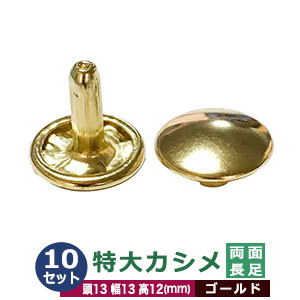 | 足の種類:両面長足 品 名:特大カシメ サイズ:頭13mm 幅13mm 高10mm 材 質:鉄 メッキ:真鍮メッキ(ゴールド) 詳 細:10セット入り1袋 ■カシメを選ぶときの目安 1.カシメ頭の大きさを選ぶ カシメの種類によって、頭の大きさが違います。 (ミニカシメ、特小カシメ、 小カシメ、中カシメ、 大カシメ、特大カシメ) 2.カシメ足の(両面/片面)を選ぶ カシメの足には「両面」「片面」があり、裏面の外観が異なります。 【片面カシメの場合】裏面(表出する金具部分)がドーナッツのように穴があきます。厚みがあまり出ないため、平たく仕上げたい時に使います。 【両面カシメの場合】裏面(表出する金具部分)が丸みを帯びた丸釦で表面と同じ様に仕上ります。やや厚みが出ます。 3.カシメ足の長さを選ぶ 取り付ける布や革の厚みによって「短足」「並足」「長足」と足の長さをお選びください。 【片面カシメの場合】 取り付ける革(布)の厚み合計+2mm=最適なカシメの足の長さ 【両面カシメの場合】 取り付ける革(布)の厚み合計+3mm=最適なカシメの足の長さ ●カシメの大きさは下記です。 ・ミニカシメはコチラ ・特小カシメはコチラ ・小カシメはコチラ ・中カシメはコチラ ・大カシメはコチラ ・特大カシメはコチラ ●カシメお得セットは下記です。 ・小袋セット ・リーズナブルなお得セット ●その他カシメは下記です。 ・飾りカシメはコチラ ・ライトストーンはコチラ ・ターコイズはコチラ ・底鋲半丸カシメはコチラ ■クラフト金具卸のカシメ金具 カシメは頭(メス)と足(オス)で一対、布や革を止める金具です。 布や革に、カシメの足を通る穴(多くは2mmないし3mm)をあけ、挟みこむようにして頭をかぶせ、足を潰してカシメをとめます。 リベットやハトメと違い、カシメは足がクルッとヒックリ返るわけではありません。 被せた頭の中で足がグシャッと潰れ止まっています。 「カシメがすぐ外れます」とのご質問いただくことがありますが、それはカシメている(足を潰している)のではなく、ただ挟んで頭を被せているだけの状態だからです。 足が潰れていない状態は「カシメている」になりません。 専用の工具(手打ち棒かハンドプレス)で上からしっかりと叩いてください。 |