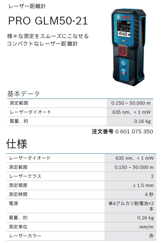 ボッシュ PRO GLM50-21 レーザー距離計 測定範囲0.15〜50m BOSCH 小型便 在庫