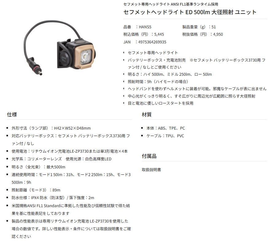 タジマ HANS5 セフメットヘッドライト ED 500lm 大径照射 ユニット TJMデザイン TAJIMA 269935 '