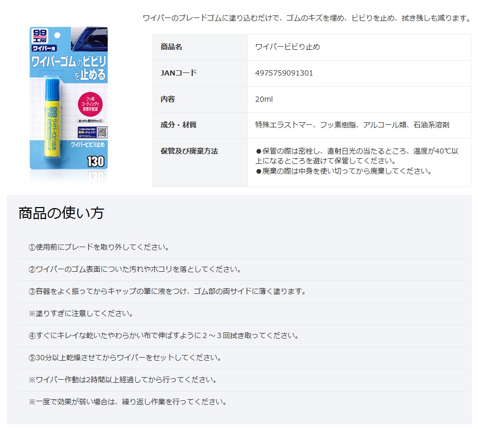 ソフト99 ワイパービビり止め 20ml 商品コード09130 SOFT99 ネコポス 在庫