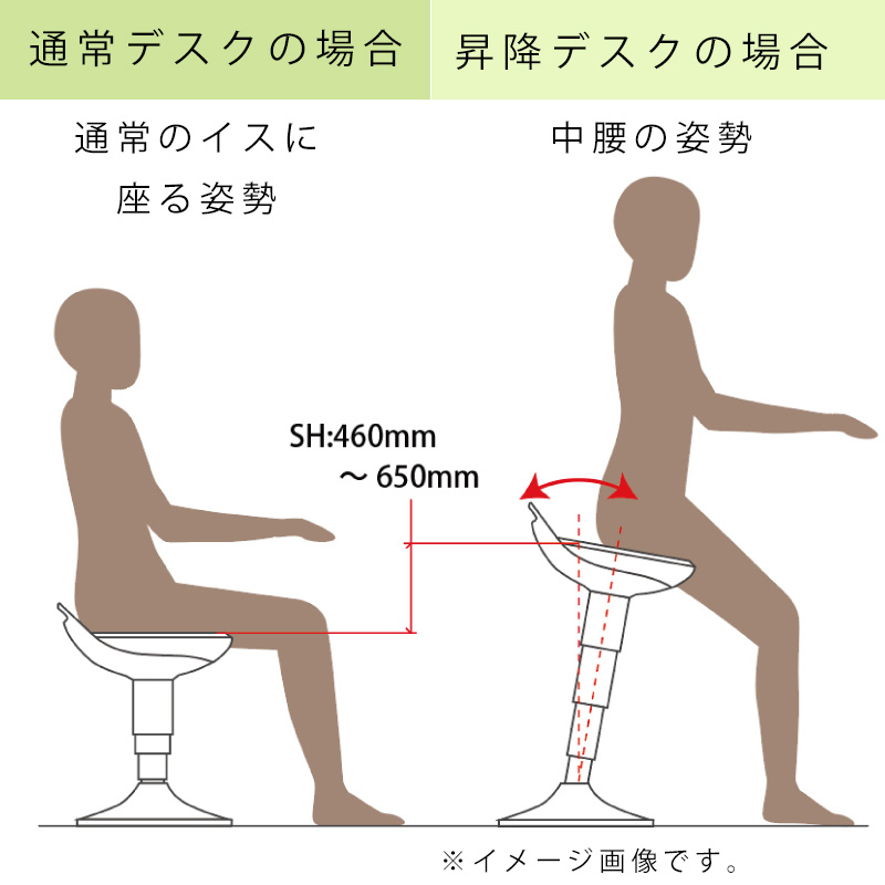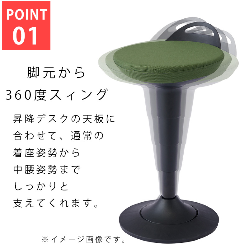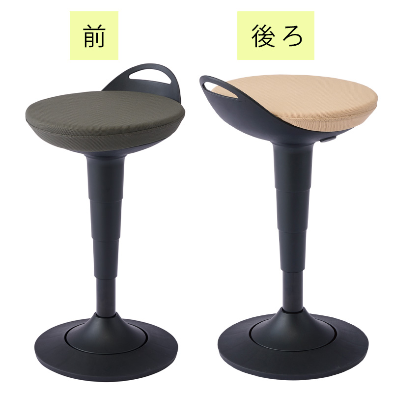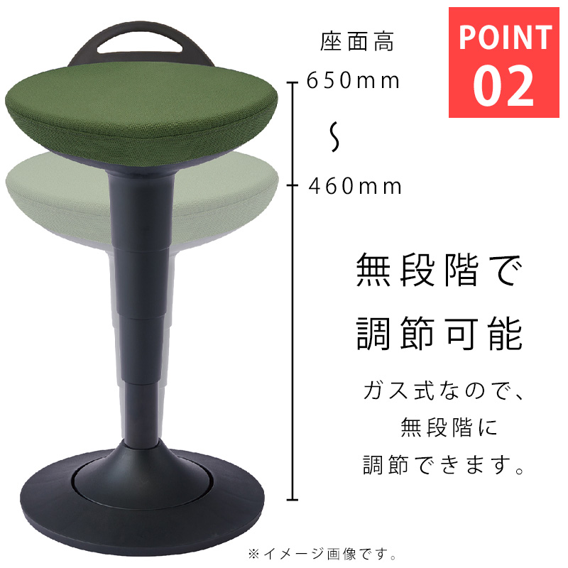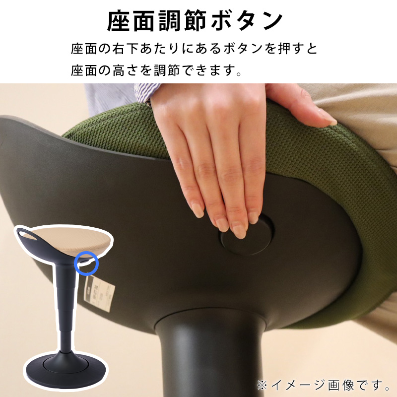 昇降デスクに向かって作業する場合はもちろん、通常の高さのデスクに向かう場合の姿勢にも対応できる座面昇降が可能なスツールです。