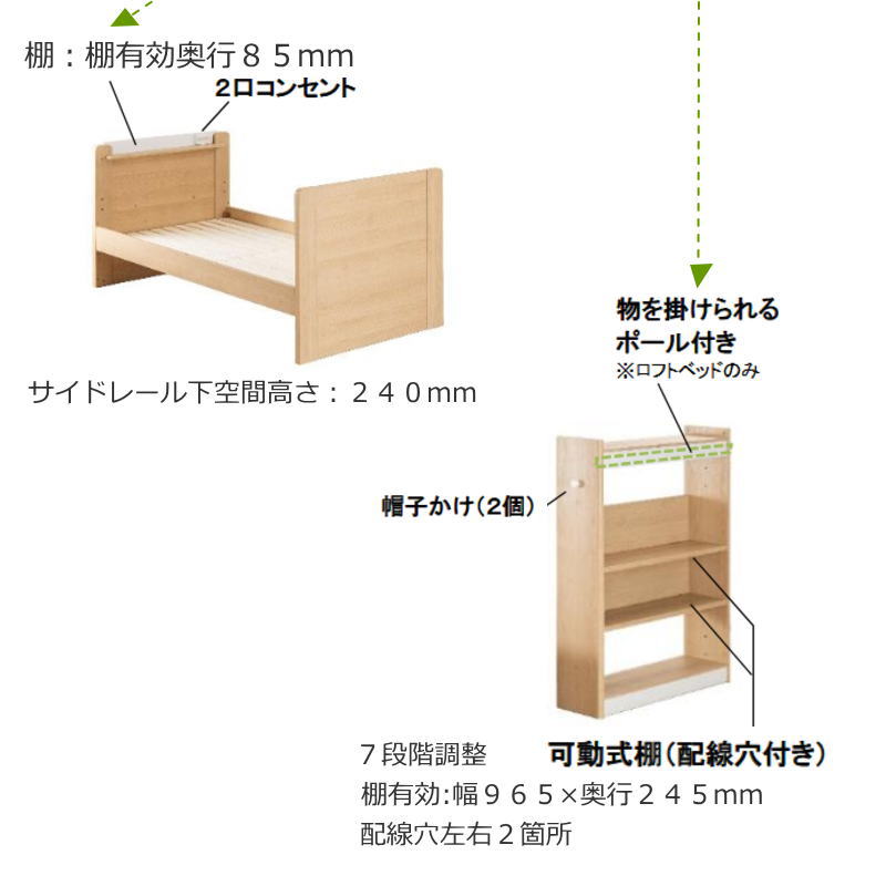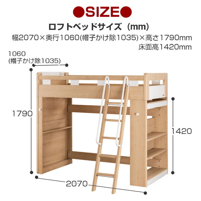 ベッド外寸 W 2070 × D 1060(帽子かけ除1035) × H 1370 ×(床面高)1420 mm
