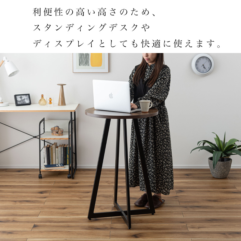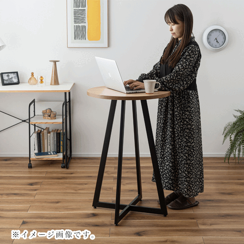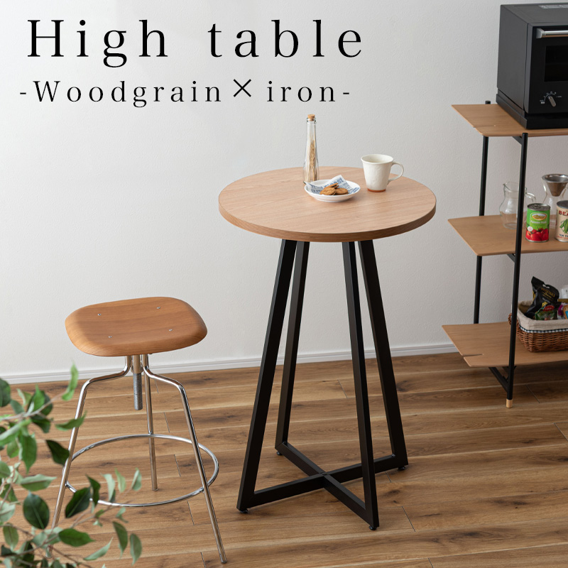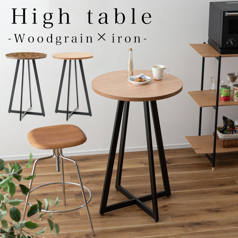 木目調デザインとアイアンでスタイリッシュな印象に 温かみのある木目調の天板と、圧迫感を与えにくいアイアンの脚部を組み合わせたハイテーブル。