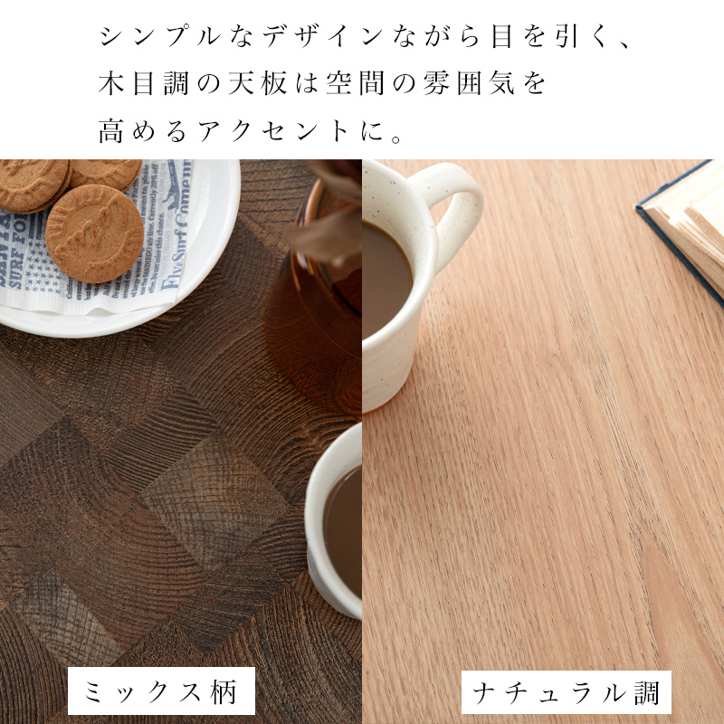 シンプルなデザインながら目を引く、木目調の天板は空間の雰囲気を高めるアクセントに。