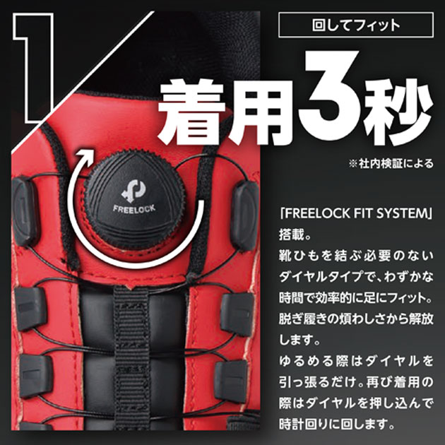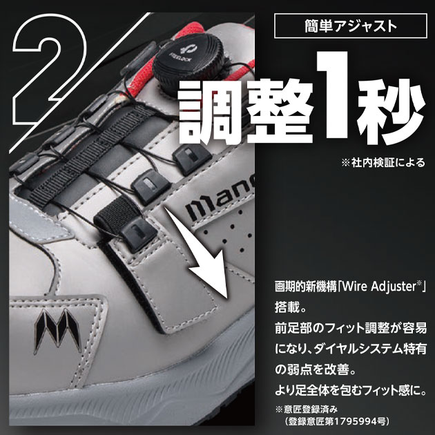 | 【特徴】 | 丸五マンダムシリーズからついにダイヤルタイプの安全靴が登場! ダイヤルから離れたつま先部分もしっかり締まる! 足を包み込むようなフィット感が最高! ◆しっかり締まるワイヤー!新機構「ワイヤーアジャスター」を採用! ダイヤルから離れた場所ほど締まりにくいというのがダイヤルの欠点… でもこの安全靴はその欠点を改善! 足全体を包むようなフィット感を実現しました! ◆ふんわりした履き心地が疲れにくい! 従来のEVAよりも柔らかく、優れたふわふわ感と反発性を発揮するクッション素材をミッドソールに初採用! 着地時の衝撃を吸収してくれるから長時間履いても疲れにくい安全靴です! ◆耐油耐滑ゴム底採用 ◆軽量化を実現した樹脂先芯 ◆ブラックのみ22.5cm〜31.0cmのサイズ展開で男女ユニセックスに対応しています! |