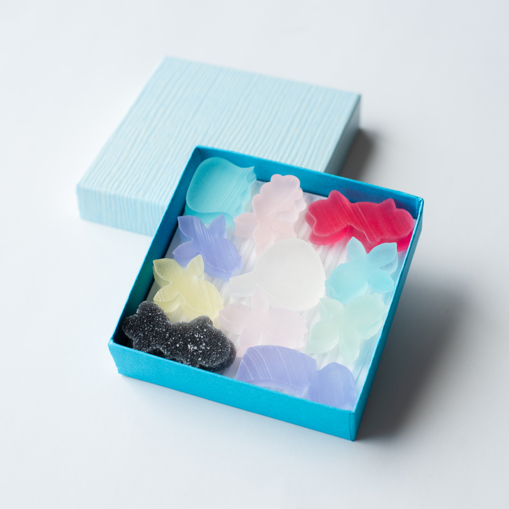 金沢では「おはじき」のことをかいちんと言います。おはじきのようにカラフルでキラキラとした繊細なお菓子です。