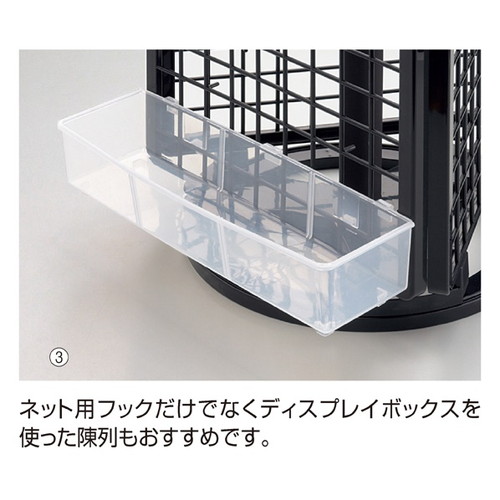 レジカウンターなど卓上のちょっとしたスペースで商品を訴求できます。陳列棚の最上段や、レジ周りで活躍する回転ネットディスプレイのローコストな樹脂製タイプ! プラスチック素材なので、金属製よりも軽くて移動に便利です。ネット用フックだけでなくディスプレイボックスを使った陳列もおすすめです。