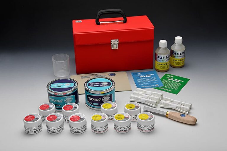 補修に伴う準備品の混合用へラ、混合板、クリーナー、補強テープ、コップも一緒に専用のカバン一つに収まっていますので、緊急時にはコンパクトに持ち運びできます。どんな状況や場面にも機敏に補修対応ができます。
