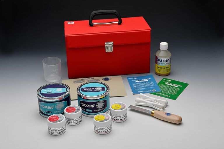 補修に伴う準備品の混合用へラ、混合板、クリーナー、補強テープ、コップも一緒に専用のカバン一つに収まっていますので、緊急時にはコンパクトに持ち運びできます。どんな状況や場面にも機敏に補修対応ができます。