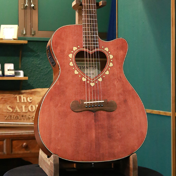 ゼマイティスの伝統的なハート型のサウンドホールの周りに特徴的なハートをちりばめたデザインとマスターシュ・ブリッジのオリジナル・デザインは非常に魅力的です。