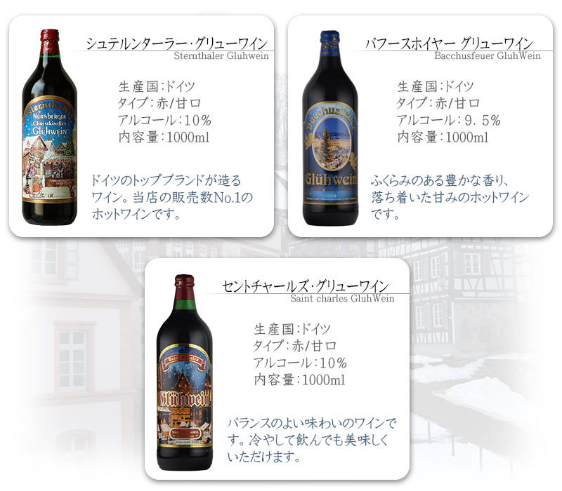 温めるだけで本場のホットワインが楽しめます。グリューワインの3種類飲み比べセットです。