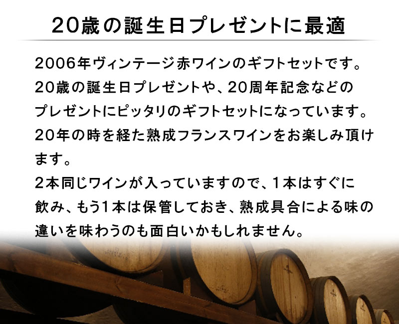 2026年に二十歳の方へのプレゼントにピッタリな2006年生まれの赤ワイン2本ギフトです。中敷きが金色の豪華なギフトボックスでお届け。