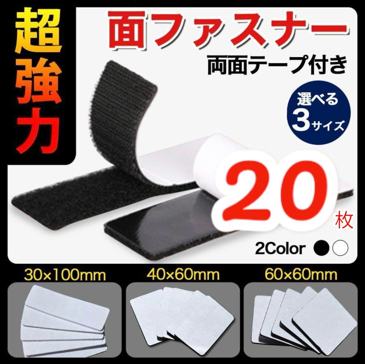 面ファスナー 20枚 強力 テープ DIY 超強力 両面テープ 固定 補修 修理 裁縫 手芸 マジック オス メス 業務 粘着 黒 白 方形